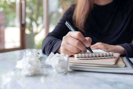 Closeup image of business woman working and squeezing papers on the table with feeling stressed and upset