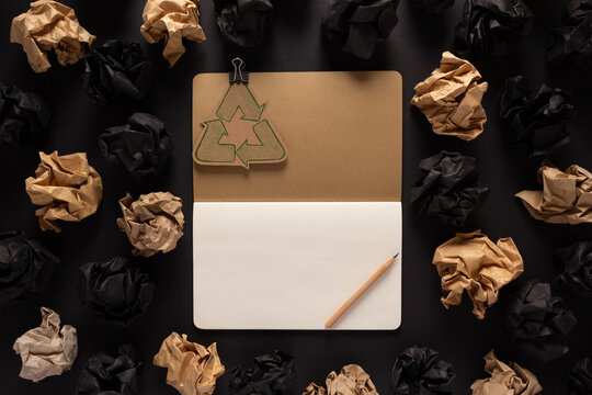 A creative business concept illustrated by crumpled paper balls and a paper plane symbolizing start up success teamwork and innovation with ample copy space image