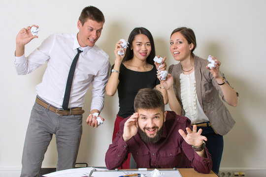 Detective processing evidence working in an office at a desk crumpled paper and throws it into a trash can, waste paper garbage basket