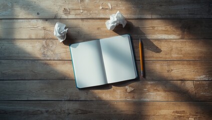 Open notebook paper with crumpled paper on wooden table, serving as an editorial background for educational content, Earth Day