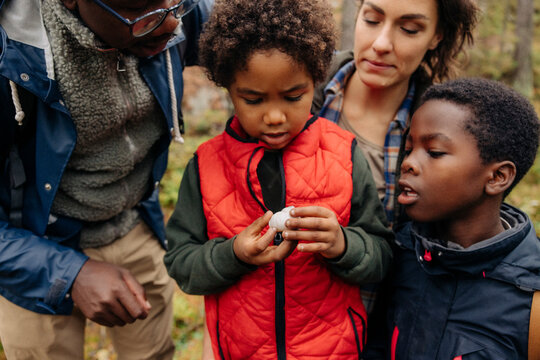 Mix of various sea shells from the crustaceans and mollusks families such as clams, oysters, scallops, conch, mussels collected in a blue barrel at the coastline of a Norwegian fjord