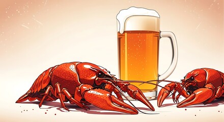 Vibrant red crustaceans accompany a frothy glass of golden beverage