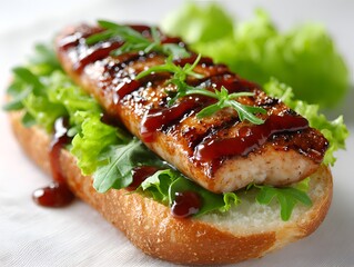 Grilled chicken breast covered in barbecue sauce sits atop fresh lettuce and arugula on a crusty roll, a delicious and inviting lunch option.
