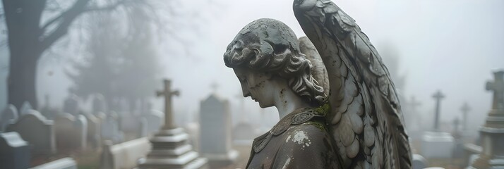 Stone statue in a cemetery surrounded. Sad grieving angel in graveyard with old destroyed crosses and tombstones. Death ceremony and memorial service. Funeral, loss, and sorrow concept