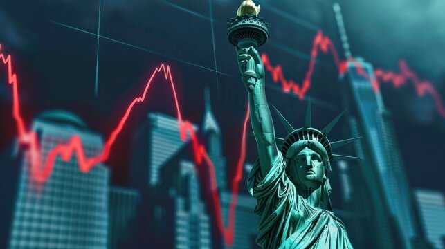 The statue of Liberty crying, inflation concept, a falling graph. The economic crisis in America. Decline in industrial production in the United States. The deterioration of the US economic indicators