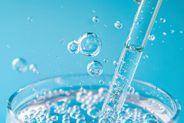 Close up view macro shot of gel with different sized bubbles comes out from lab dropper into petri dish on blue background.