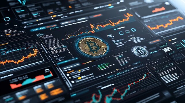 Data visualization dashboard with multiple charts and graphs.  Dark blue color scheme.  Complex financial data display