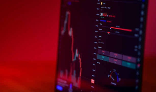 Bitcoin price is falling down and the entire crypto currency market is loosing money. The graph evolution of this coin on a laptop screen with red background. Strong sell signal.