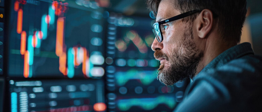 Stock trading investor, trader or broker analyst working analysing exchange market using computer investing money in financial market analyzing charts data looking at computer screen.