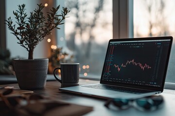 Displaying nft sales chart and buy button on laptop at coworking desk with data overlays