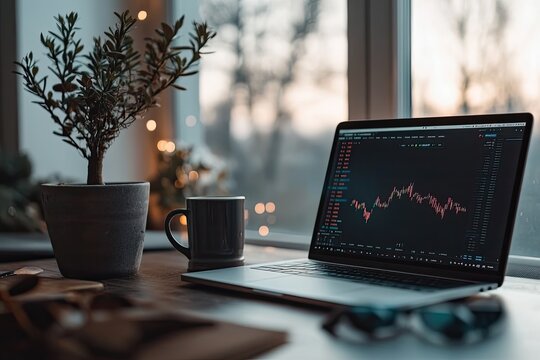 financial analyst working on crypto report their laptop screen reflecting bright trading data against dark modern office