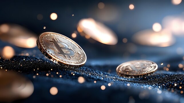 Shiny cryptocurrency coins on dark glittering surface with bokeh lights and shallow depth of field, creating dramatic financial technology atmosphere.