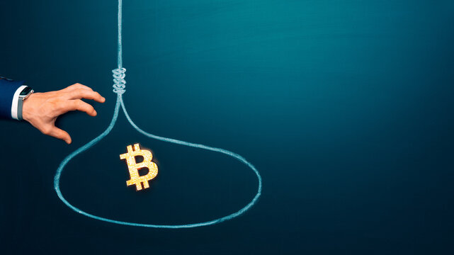 Trapped concept. Businessman hand trying to reach the money trap with bitcoin. Copy space