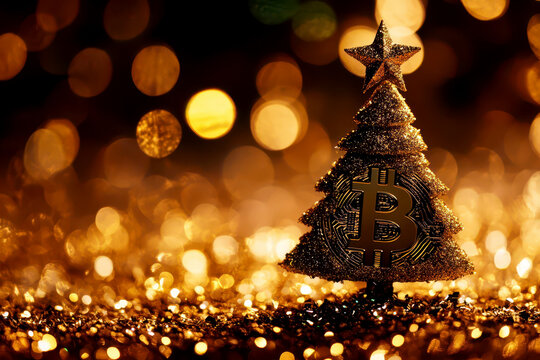 Merry Christmas and Happy new year Bitcoin cryptocurrency still life background concept. Crypto currency bitcoin on a Christmas background.