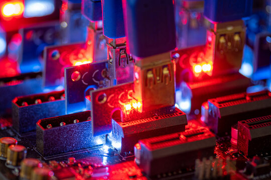 Cryptocurrency equipment mining bitcoin and ethereum electronic money in cyber space close-up. Large-scale motherboard with sensors and LED red and blue lights for close-up cryptocurrency mining.