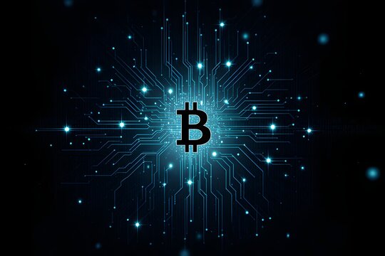 Glowing bitcoin symbol with circuit board elements in background
