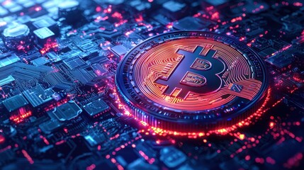 Bitcoin cryptocurrency coin shining on a red circuit board background