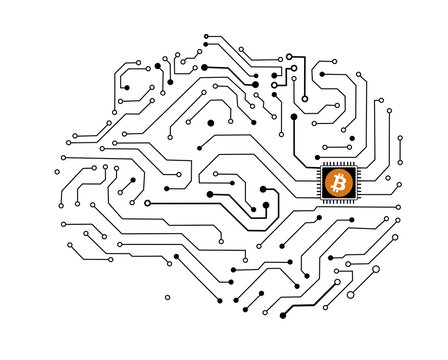 Concept of computer circuit computer board for bitcoin mining. Devices and technology for mining cryptocurrency.