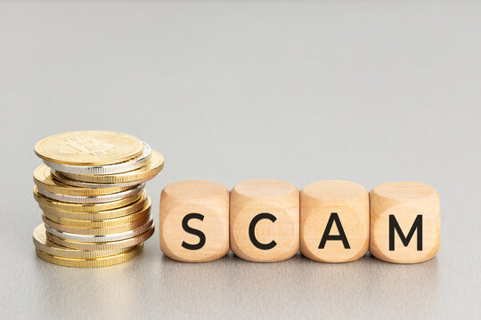 Cryptocurrency Scam concept. Stacked crypto coins and wooden blocks with text. Copy space