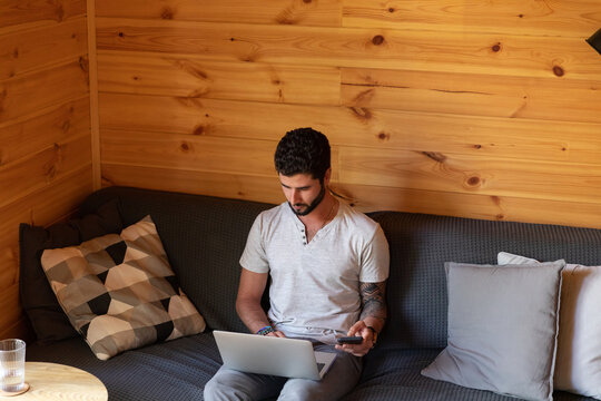 Mid-adult woman researching nft owl artwork on laptop at home desk with market chart