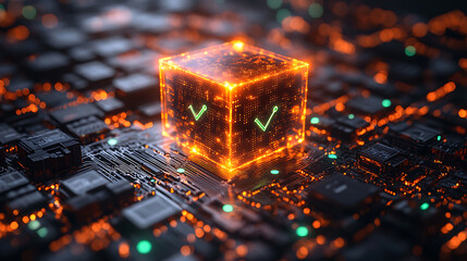 Glowing Cube with Checkmarks on Circuit Board - Digital Security and Technology Concept