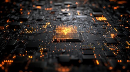 Futuristic circuit board with glowing connections and data flow