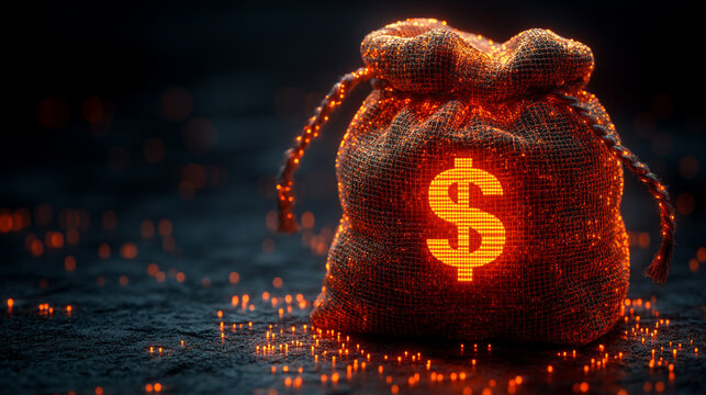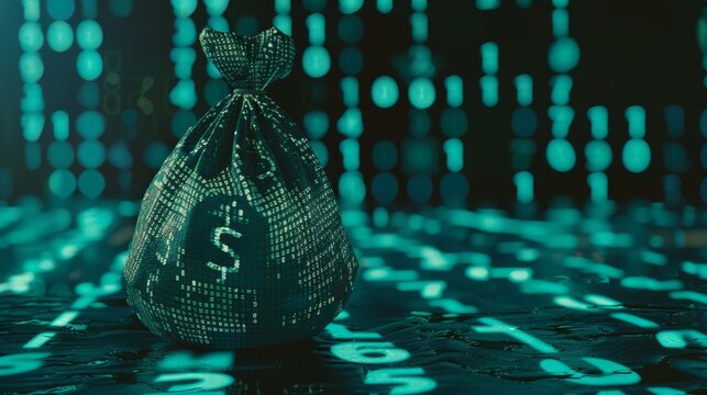 A bag adorned with a digital dollar sign glows amidst a backdrop of binary code, symbolizing the fusion of finance and technology.