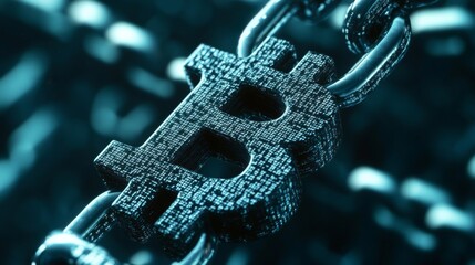 Digital Representation of Blockchain Technology Featuring Bitcoin Symbol Amidst Interconnected Chains in a Futuristic Environment