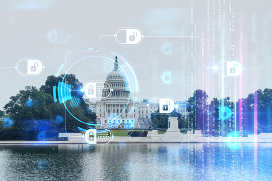Capitol dome building exterior, Washington DC, USA. Home of Congress and Capitol Hill. American political system. Decentralized economy. Blockchain, cryptography and cryptocurrency concept, hologram