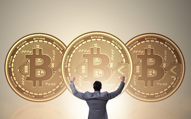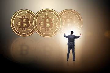 Businessman walking towards bitcoins in cryptocurrency blockchai