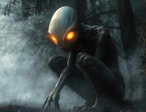Dover Demon Encounter in Foggy Forest with Glowing Eyes and Eerie Atmosphere