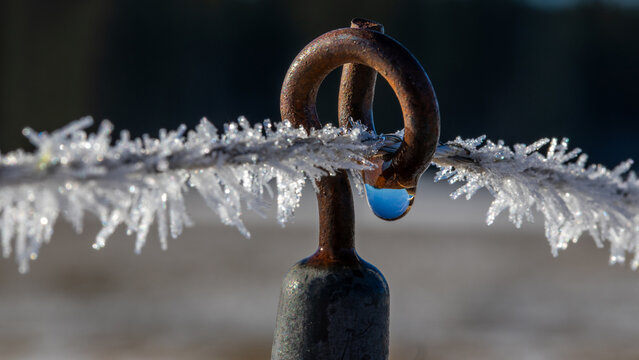 Frosted branch glistening with delicate ice crystals and soft snowy bokeh background