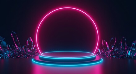 Neon glowing circle and platform with crystal clusters