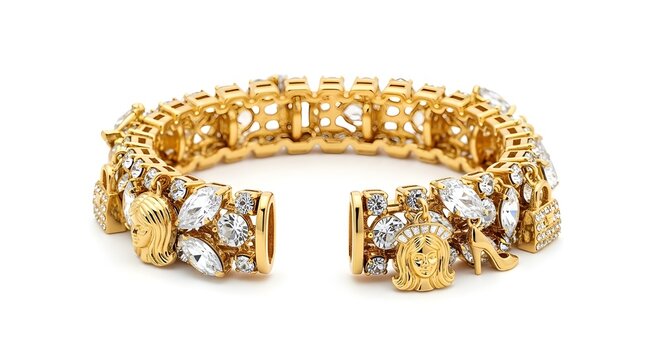 Ornate luxury gold cuff bracelet adorned with sparkling clear gemstones for high-end fashion display isolated PNG with Transparent Background