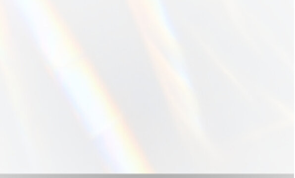 Blurred rainbow light refraction texture overlay effect for photo and mockups. Organic drop diagonal holographic flare on a white wall. Shadows for natural light effects