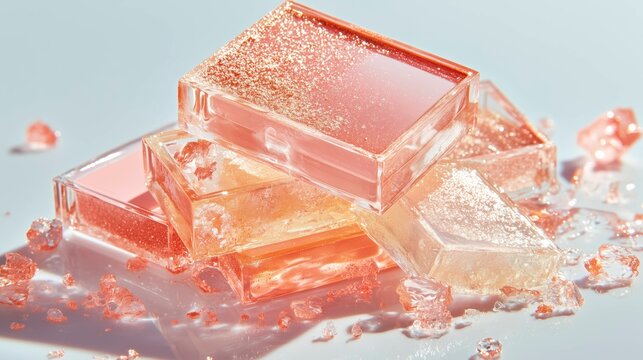 Stack of translucent pink-gold glycerin soap bars with glitter and coarse salt crystals on a glossy surface under soft studio light.