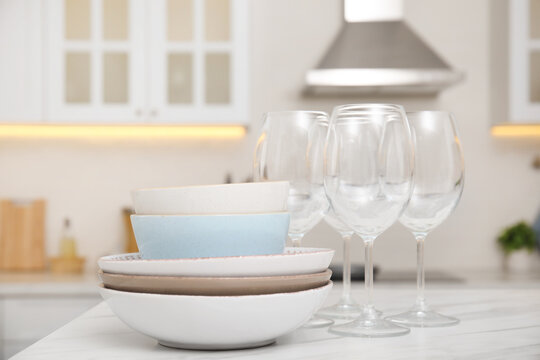 set for the kitchen on a white background, Glassware retro old. Crystal transparent utensils. Fruit bowl. vase, glass plate for dessert, serving tea. glass, wine glass.old, isolated. vintage