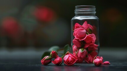 Cut-crystal jar reflecting on dark wood resting beside pale pink petal