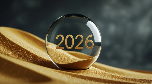 Golden 2026 inside a crystal ball on abstract sand dunes, symbolizing future predictions and time passing