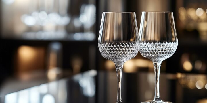 Lining stemware along illuminated bar counter upscale lounge reflections ambient lighting