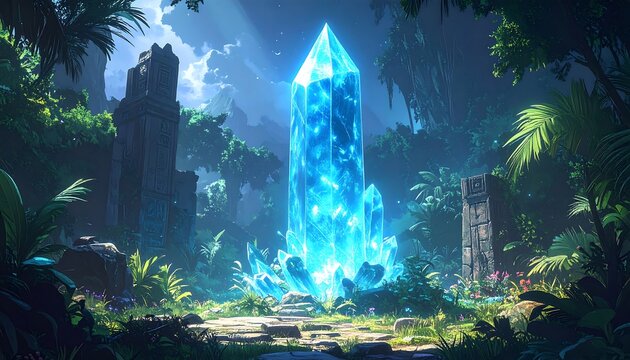 A luminous blue crystal towers in a verdant, overgrown jungle setting