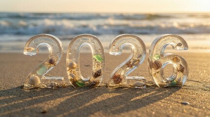 2026 new year at beach,transparent glass numbers filled with seashells,sunset ocean celebration scene
