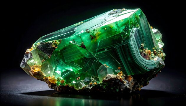 A vibrant green mineral cluster with linear patterns, set against a dark backdrop, highlighting its crystalline structure