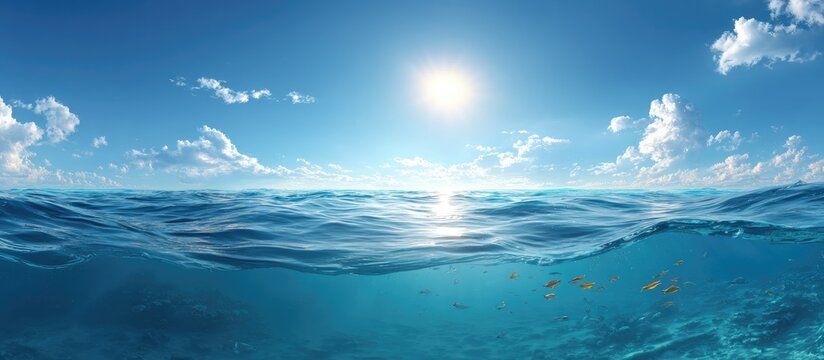 Bright sun shines over clear blue ocean with schools of fish below surface
