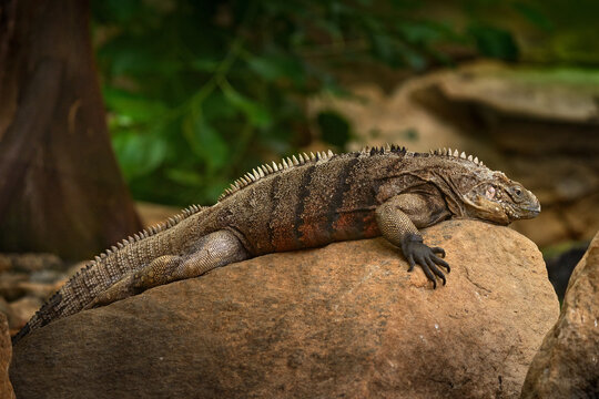 Cuban rock iguana, Cyclura nubila, lizard on the stone in the nature habitat. Reptile on the rock, Cuba, Cetral America. Wildlife scene from nature.