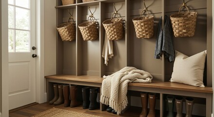 A bright entryway showcases a built-in storage system with woven baskets, a wooden bench, and a textured rug against the backdrop of an open doorway.
