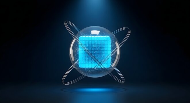 A glowing blue cube with a grid pattern is encased in a transparent sphere, surrounded by orbiting rings, illuminated by a spotlight against a dark background.