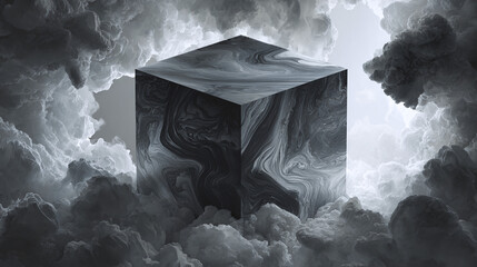 A captivating image of a cube amidst swirling clouds, evoking a sense of mystery and depth. The cube appears to be floating within the atmospheric environment.