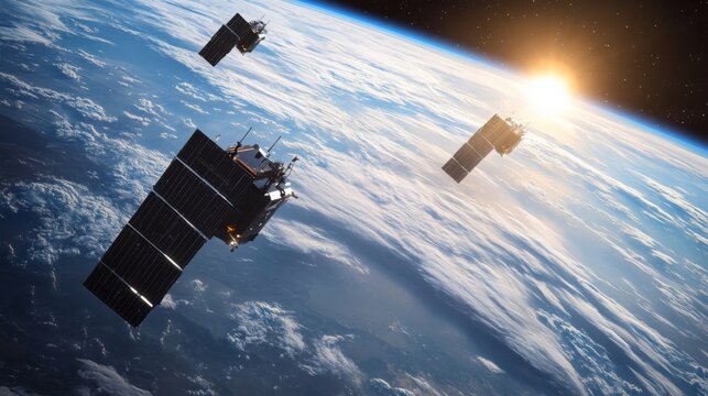 Three satellites are orbiting Earth during dawn, with the sun rising in the background. The atmosphere is illuminated, showcasing the beauty of space and technology working together.