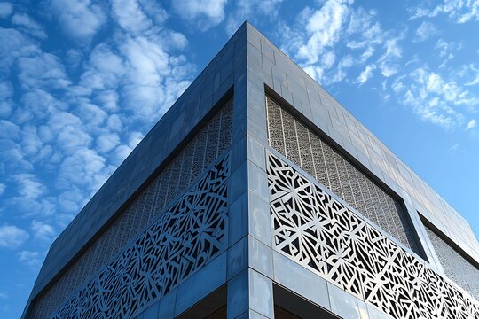 a building with a modern cubic design and intricate patterns from traditional islamic architectures